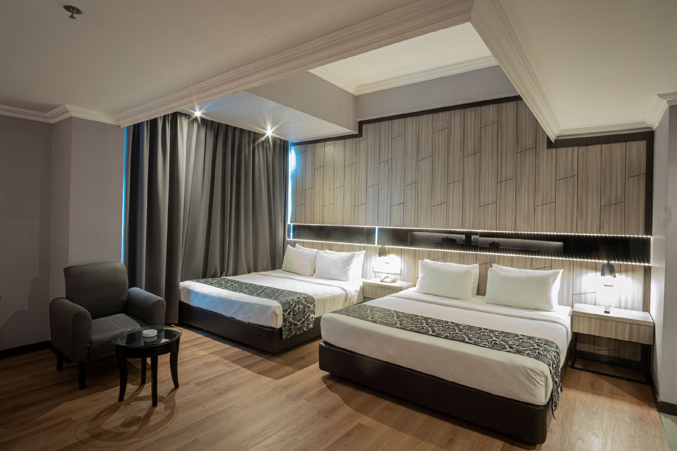 Enjoy a modern minimalist design in our 39 m² Family Room, featuring two king-size beds for ultimate comfort. Choose between city or pool views and relax in a cozy armchair on elegant parquet flooring. Stay...